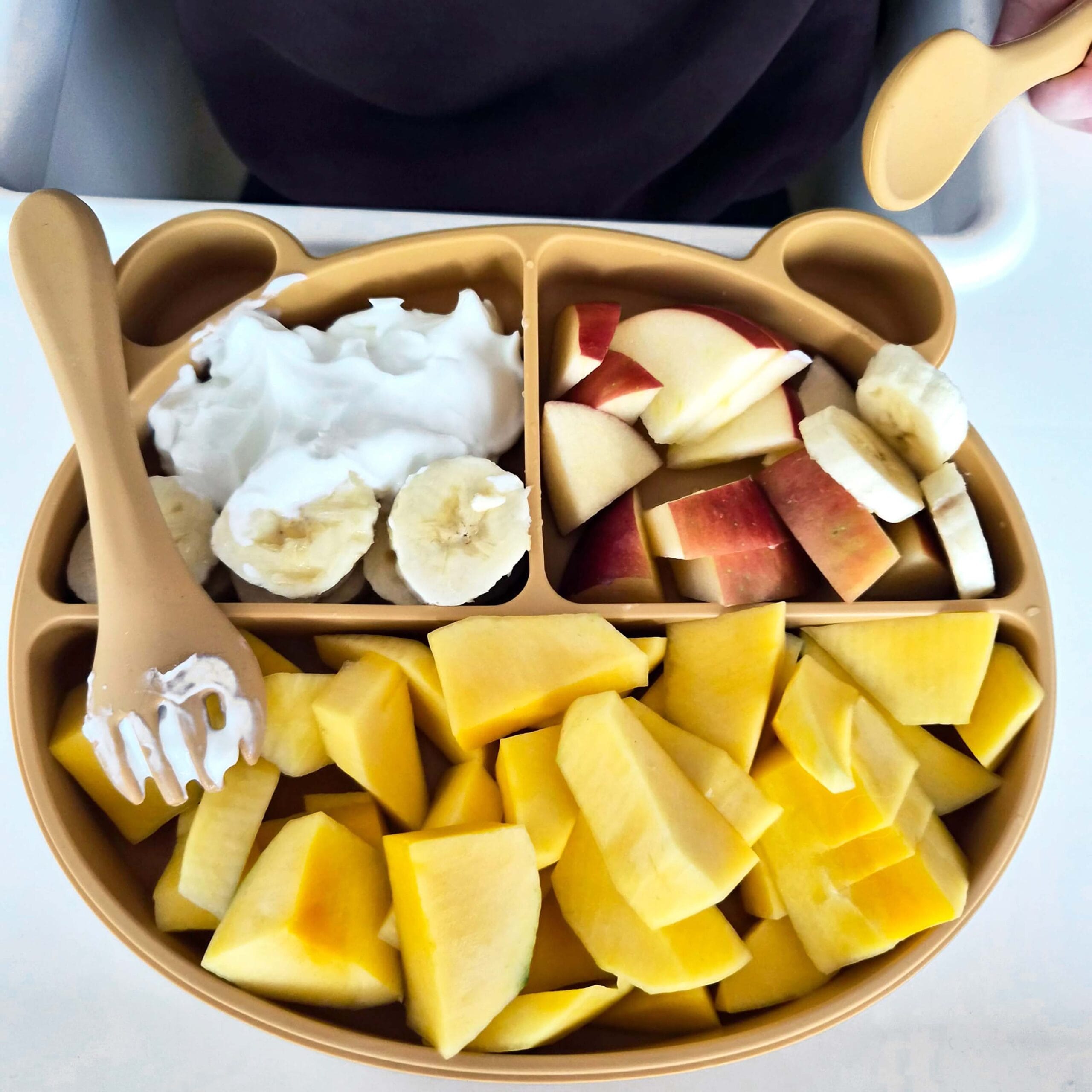 Měkký a pružný materiál je šetrný k citlivým dásním i prvním zoubkům a zároveň dostatečně pevný, aby se s příbory dobře nabíralo jídlo. Ergonomický tvar je přizpůsobený malým dětským ručičkám, takže se příbory snadno drží a podporují dítě v prvních pokusech o samostatné stolování. Díky jednoduchému a hravému designu se jídlo stává příjemnou a přirozenou součástí dne – bez stresu a slziček.