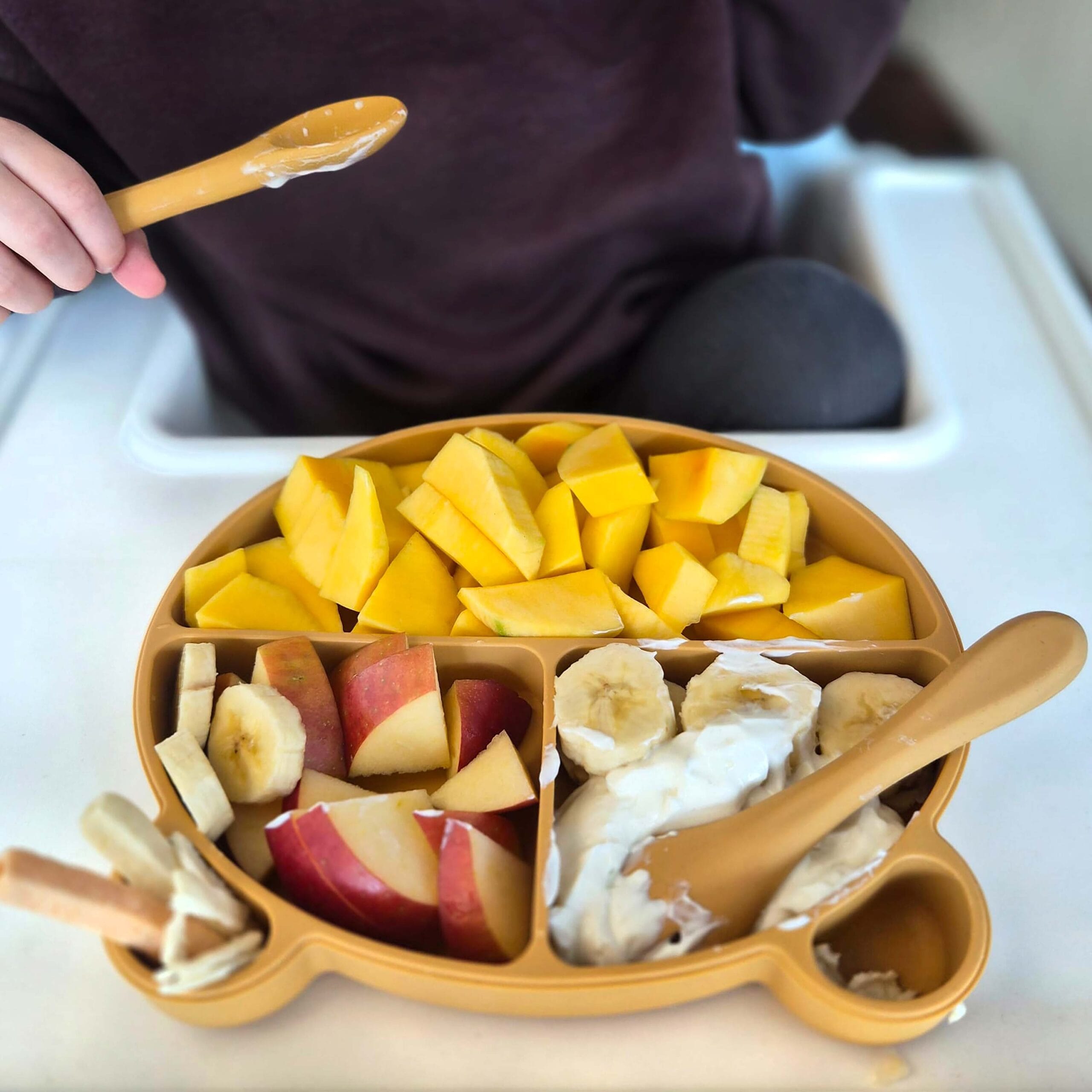 Tři oddělené části pomáhají dětem lépe vnímat jednotlivé chutě a podporují jejich zájem o jídlo. Talíř lze využít také jako mističku na svačiny, ovoce nebo kaše doma i na cestách. Před použitím doporučujeme povrch stolu vždy otřít a přísavku přitlačit na hladkou plochu, aby držela co nejpevněji.