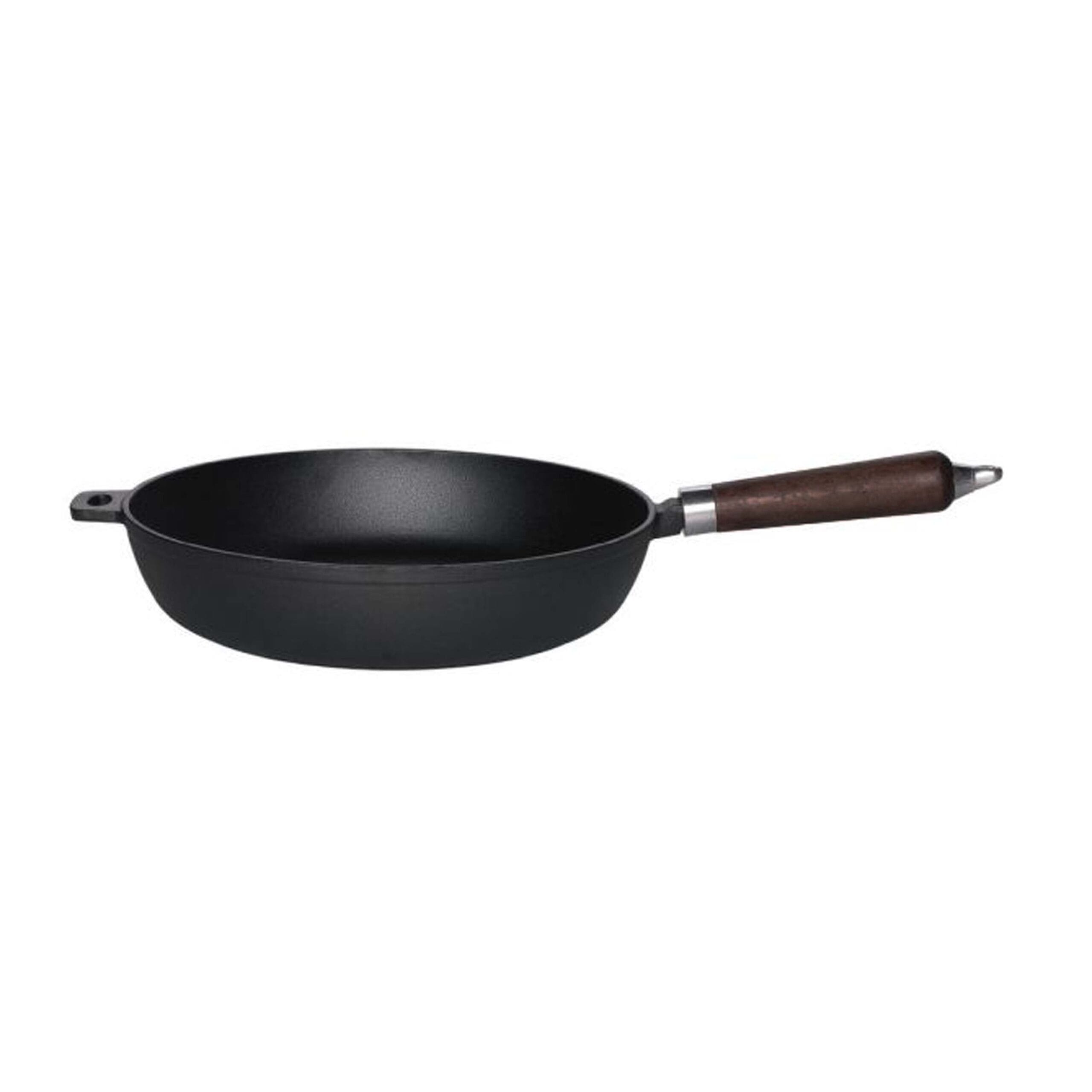 Velkou výhodou litiny je také její dlouhá životnost – při správné péči vám pánev vydrží dlouhé roky a často se předává i mezi generacemi. Postupem času si navíc vytváří přirozeně nepřilnavý povrch, který zlepšuje její vlastnosti při každém dalším použití. Dřevěná rukojeť zajišťuje pohodlný úchop a dodává pánvi elegantní vzhled, který se hodí jak do moderní kuchyně, tak i na chalupu. Litinová pánev KITCHISIMO Maestro je předem ošetřena rostlinným olejem a je tepelně odolná až do 260°C.