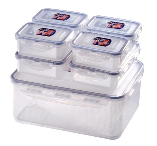 sada 7 dóz lock s patentními víky. Dózy lock jsou bezpečné a funkční nádoby vyrobené z kvalitního plastu, který je trvanlivý a odolává vysokým teplotám. Tyto dózy jsou 100% vzduchotěsné a tím zajišťují dlouhodobou čerstvost uchovávaných potravin. Čtyři pohyblivé „klipy“ zajišťující víko jsou odolné proti opotřebení.