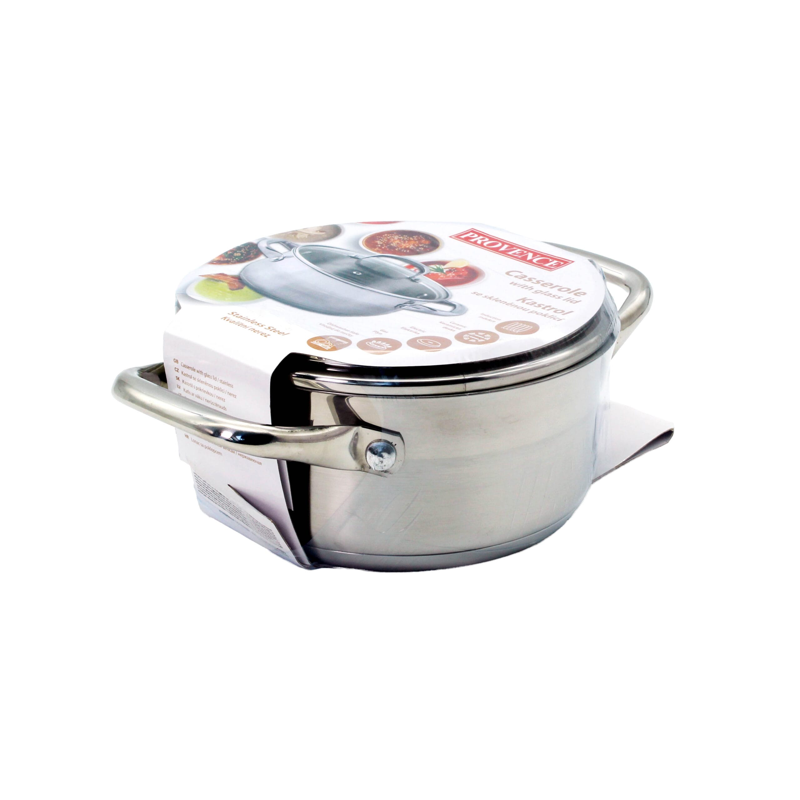Kastrol PROVENCE 5 l (∅ 24cm) z vysoce kvalitní nerezové oceli je praktickým pomocníkem pro každodenní vaření i sváteční hostiny. Díky dvojitému sendvičovému dnu zajišťuje rovnoměrné rozložení tepla, čímž zkracuje dobu přípravy, zabraňuje připalování a šetří energii. Pevně přinýtovaná madla zajistí bezpečný úchop i při plném obsahu, kastrol je zároveň vhodný i do trouby (bez poklice), což rozšiřuje možnosti použití. Skleněná poklice s kovovým okrajem, který ochrání pokličku před poškozením, a otvorem pro únik páry umožňuje pohodlnou kontrolu během vaření bez nutnosti nadzvedávání. Moderní lesklý povrch dodává kastrolu elegantní vzhled a díky univerzálnímu dnu ho můžete používat na všech typech varných desek, včetně indukce