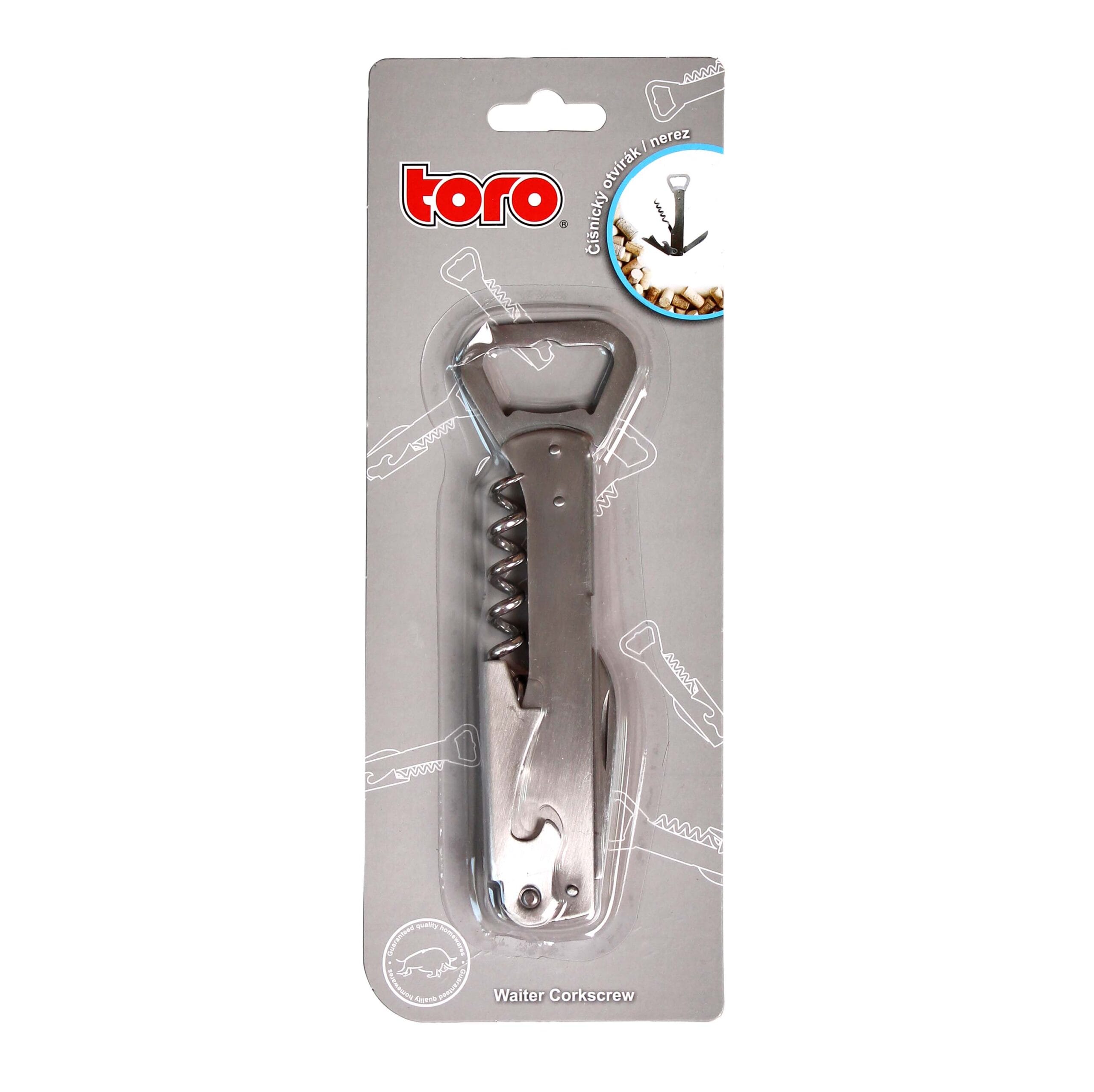 multifunkční otvírák je nepostradatelným pomocníkem v domácnosti. Obsahuje: otvírák lahví s korunkovým uzávěrem, vývrtku, otvírák konzerv a malý nožík. Prodáván je pod značkou TORO na závěsné kartě. Rozměry – 13, 5 x 3 cm