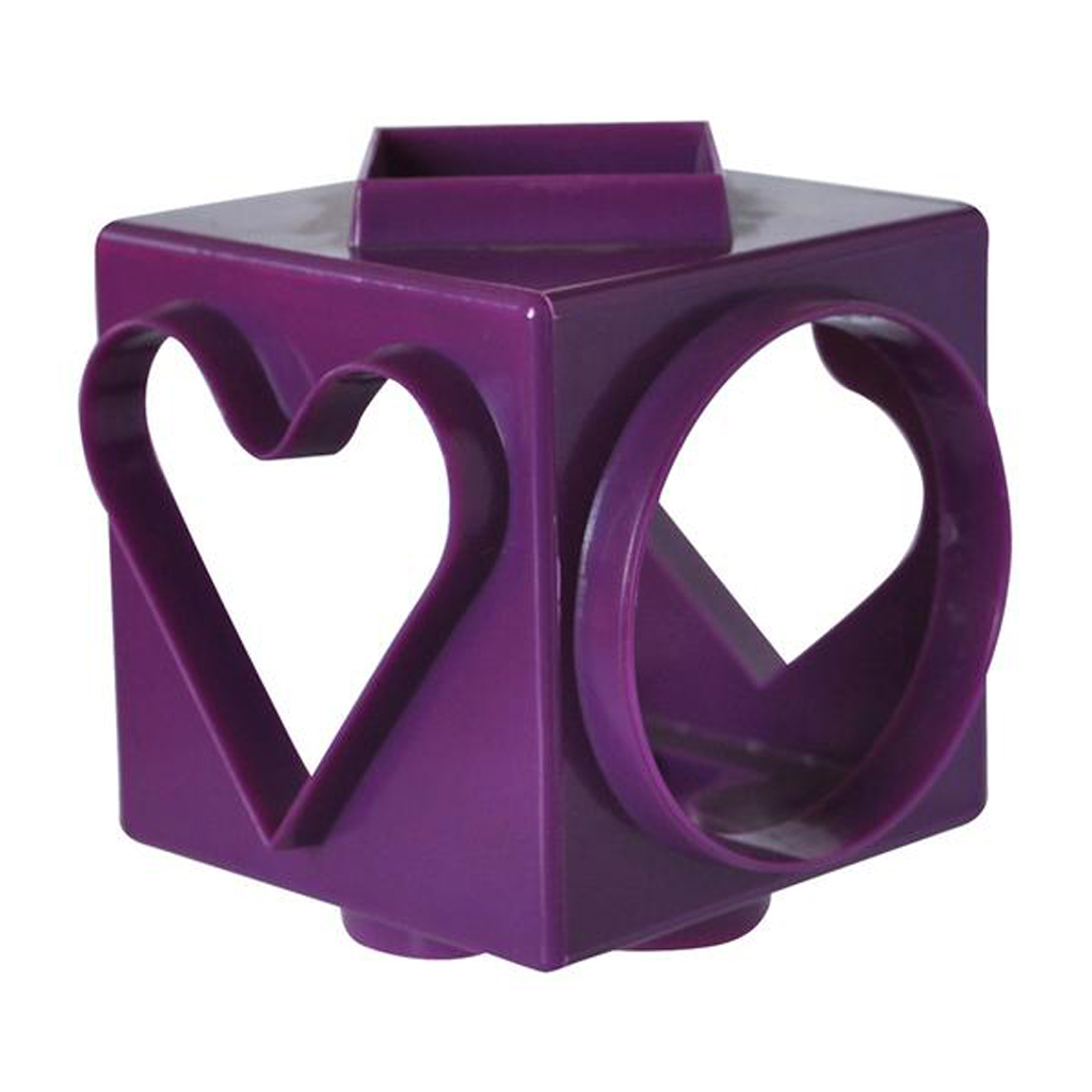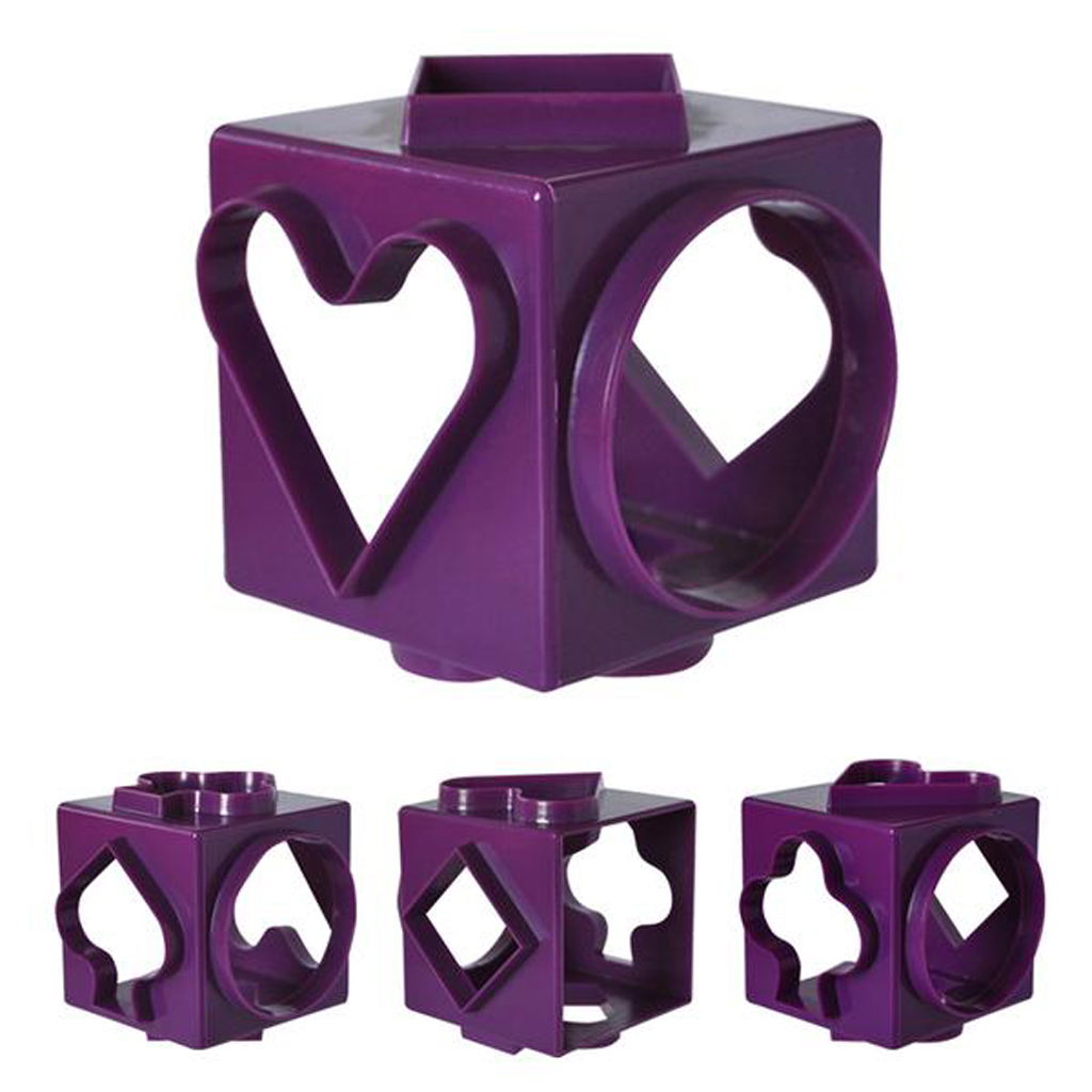 plastová vykrajovátka na cukroví ve tvaru krychle, kde každou stranou jednoduše vykrojíte jiný tvar – kruh, čtverec, kosočverec, srdce, 2 různé tvary stromu. Rozměry – 7,5 x 7,5 x 7,5 cm