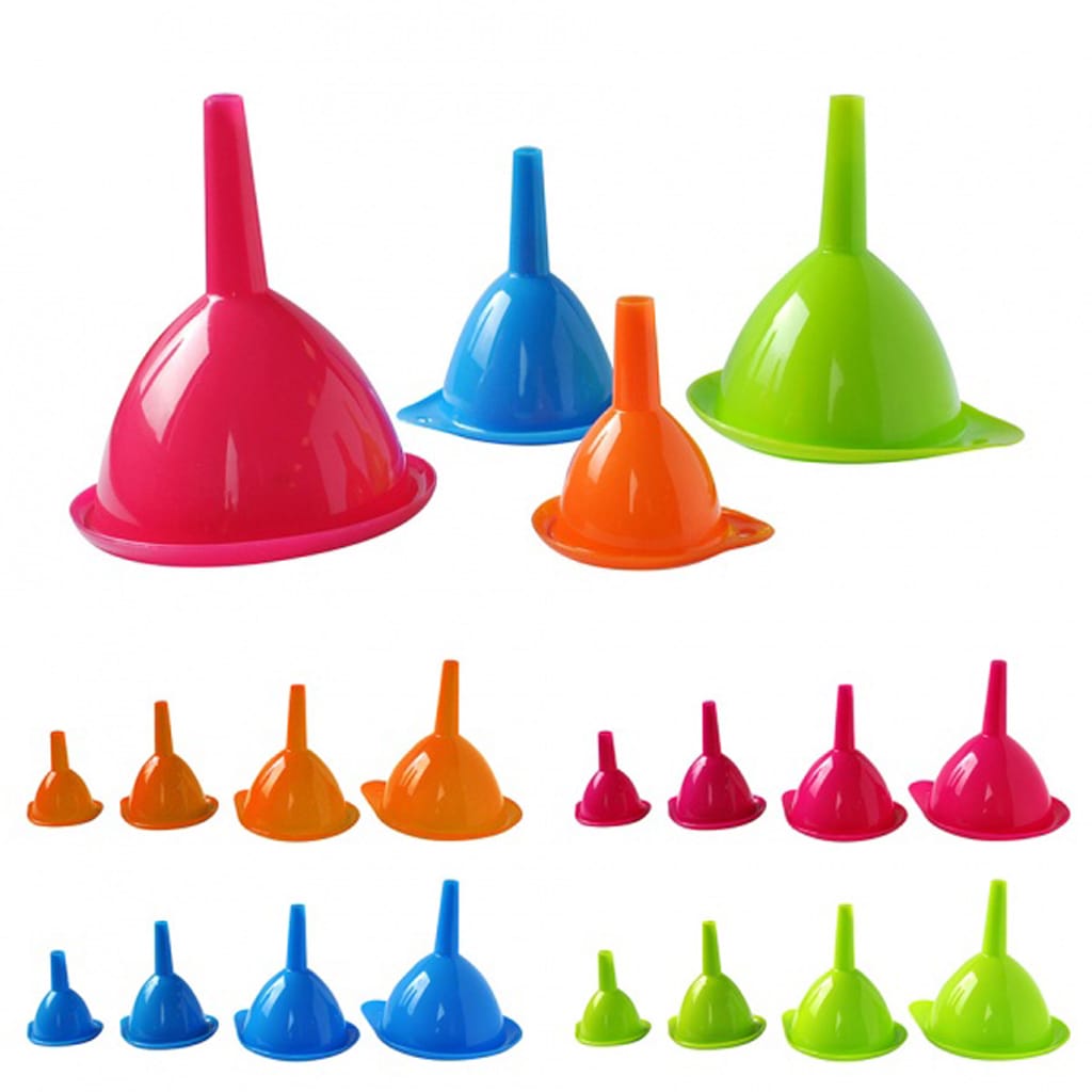sada trychtýřů různých velikostí vyrobená ze zdravotně nezávadného plastu. Trychtýře jsou vhodné do myčky. Balení obsahuje 4 ks. Assort barev. Rozměry – 13,1 x 14, 5 cm.