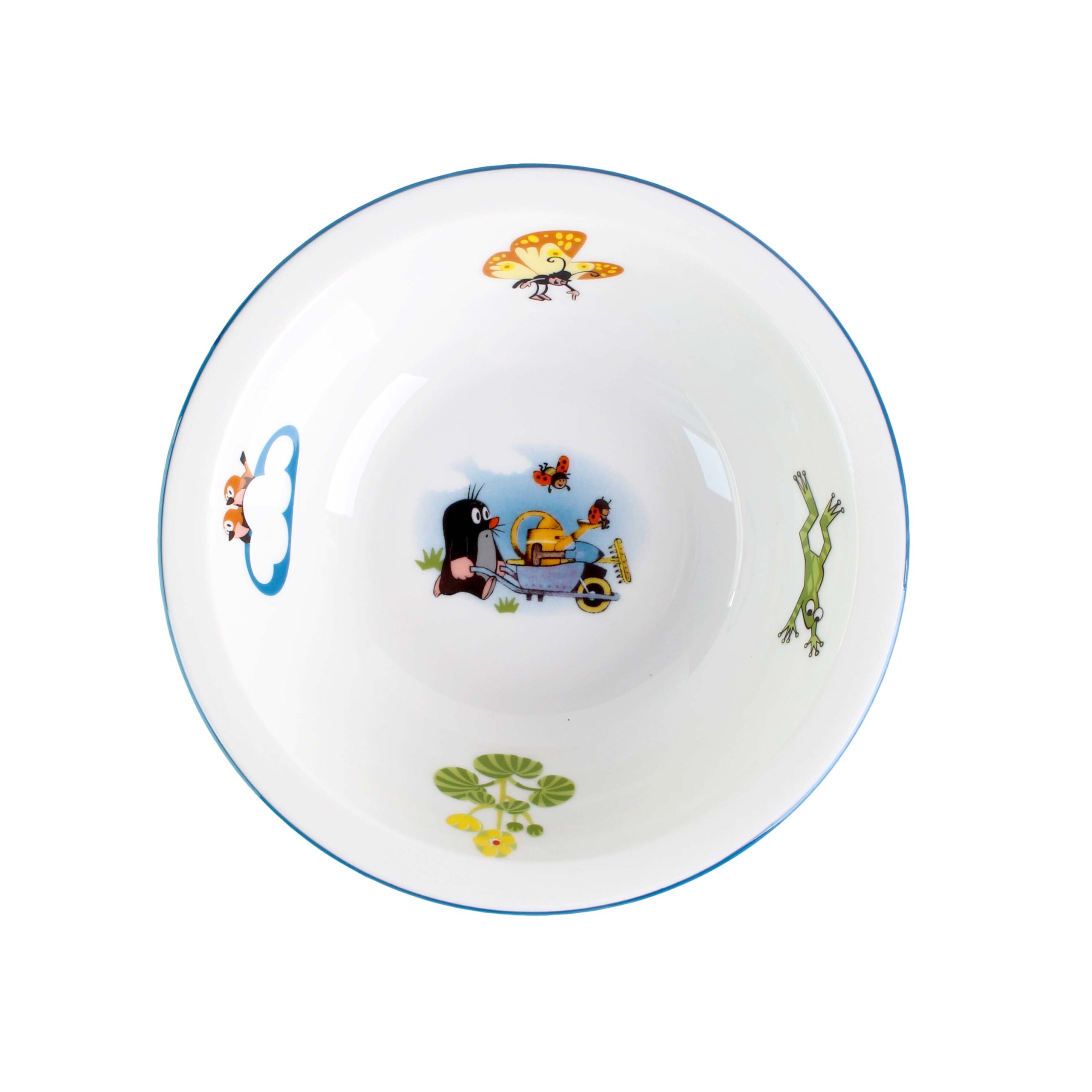 Dětská porcelánová miska „Krtek“ z populárního večerníčku. Tradiční kvalita českého porcelánu. Každý produkt je zdravotně nezávadný a certifikovaný. Lehké pro dětské užívání. Lze mýt v myčce. Objem misky 300ml. Rozměry – 6,7 x 4,8 cm, vnější průměr 17 cm. Mix motivů.