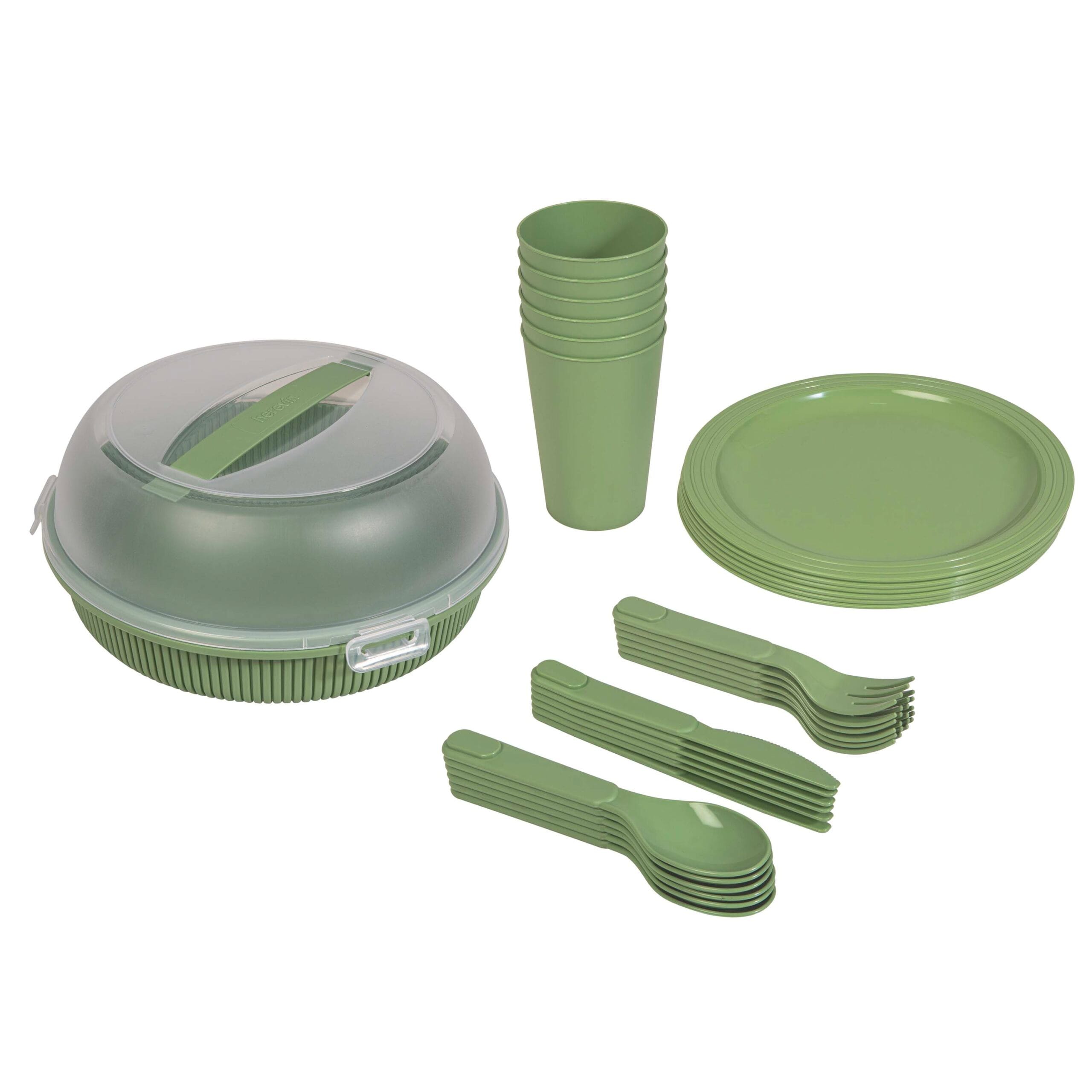 Plastová sada nádobí na piknik TORO obsahující 32 dílů je ideální řešení pro pohodlné stolování na zahradě, výletech nebo dovolené. Najdete v ní vše potřebné pro šest osob – 6x talíř, 6x kelímek, 6x lžíce, 6x vidlička, 6x nůž a velké dóza s víkem, takže nemusíte nic složitě řešit ani balit zvlášť. Podobné piknikové sety jsou oblíbené právě díky své praktičnosti a kompletnosti pro více osob. Velkou výhodou je praktická úložná dóza, ve které je celá sada uložená. Tu můžete po vybalení bez problémů využít i samostatně jako klasickou dózu na potraviny – ideální například na přenášení jídla nebo skladování surovin. Víko je vybavené uchem pro pohodlné přenášení a třemi pevnými klipy, které zajišťují bezpečné uzavření během transportu.