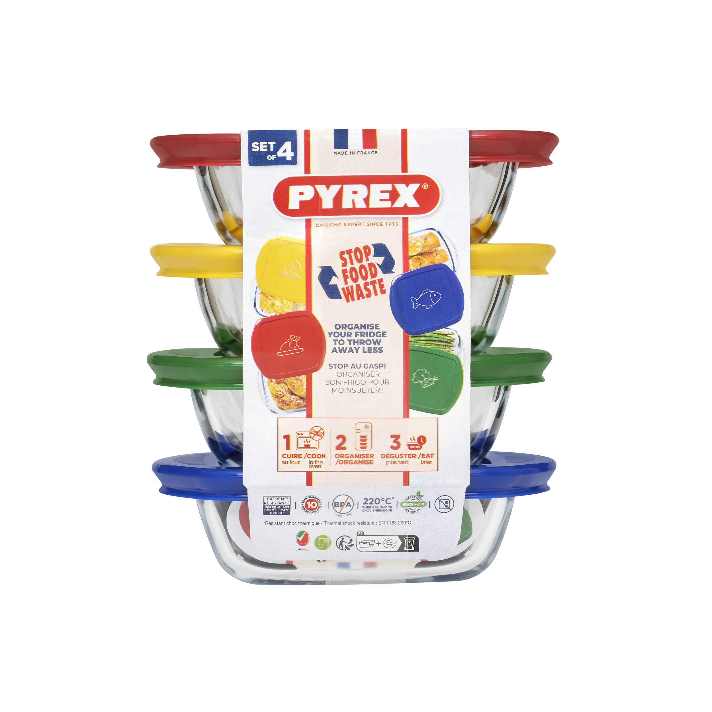 Sada čtyř čtvercových dóz Pyrex Cook & Store 0,3 l s praktickým víkem je skvělou volbou pro každodenní přípravu a skladování menších porcí. Objevte zcela nový způsob vaření organizovaným a ekologickým způsobem se sadou nádob z borosilikátového skla Pyrex®, vhodnou pro skladování těstovin a zeleniny. Miska se žlutým víčkem, určená pro vaše oblíbené těstoviny, se zeleným víčkem, speciálně navržená pro zachování čerstvosti vašich salátů, ovoce a zeleniny, s červeným víčkem, určená pro chutné maso, a s modrým víčkem, speciálně navržená pro mořské pochoutky, usnadňují identifikaci obsahu přímo v chladničce nebo mrazničce. To je dobrý způsob, jak lépe uchovat potraviny, udržet čerstvost a zabránit promeškání data spotřeby. Misky můžete použít k pečení, zapékání i k ohřevu v mikrovlnce, a po vychladnutí také pro uložení do mrazáku. Transparentní borosilikátové sklo nechává vyniknout barvám i struktuře pokrmu a víko udrží jídlo déle čerstvé – ideální pomocník pro rychlé večeře i organizaci každodenní kuchyně.