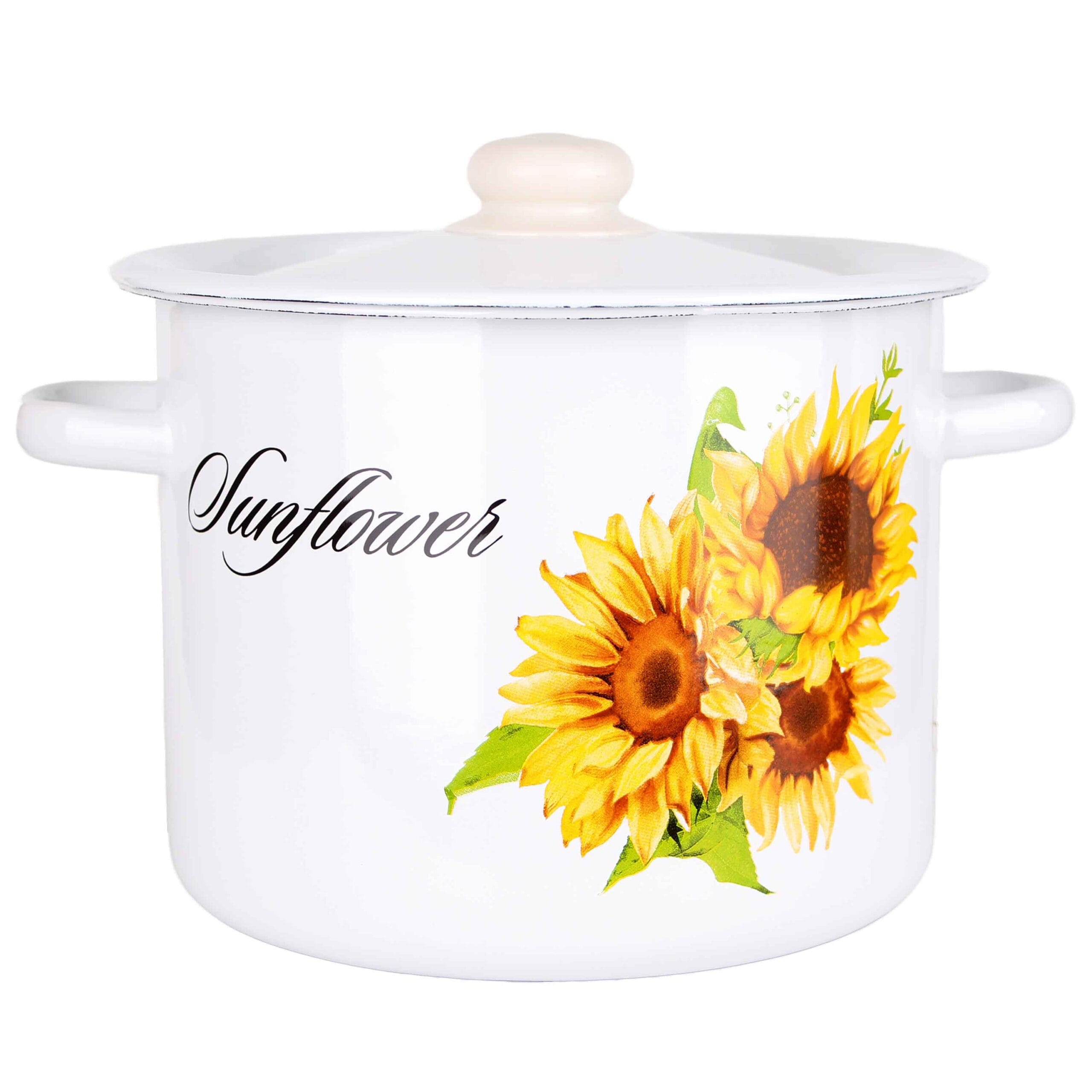 Smaltovaný hrnec TORO o objemu 5,5 litru s motivem slunečnice je ideální volbou pro větší rodinné vaření i přípravu pokrmů do zásoby. Bílé provedení doplněné výrazným květinovým dekorem působí svěže, lehce retro a přináší do kuchyně příjemnou atmosféru domácí pohody.